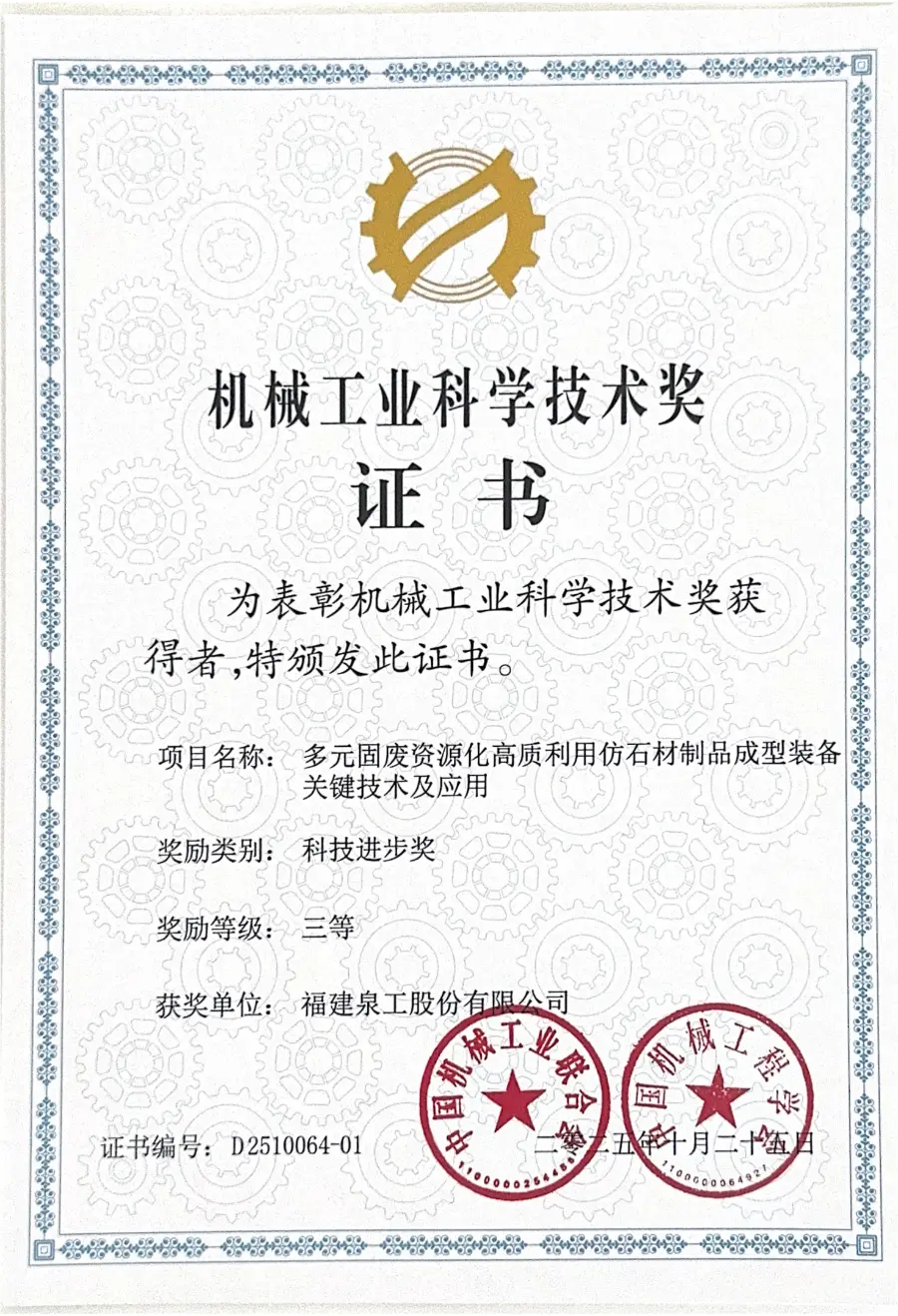 Жақында 2025 Қытай машина жасау өнеркәсібі ғылым және технология сыйлығының жеңімпаздарының тізімі ресми түрде жарияланды. Fujian Quangong Machinery Co., Ltd басқарған «Дерверсификацияланған қатты қалдықтар ресурстарын имитацияланған тас өнімдеріне айналдыру үшін жоғары құнды пайдалану үшін қалыптау жабдығының негізгі технологиялары мен қолданбалары» жобасы технологиялық прогрес үшін үшінші жүлдені жеңіп алды. Бұл марапат жоғары деңгейде танылғанын толық көрсетедіQuangong Machinery Co., Ltd.ҚТҚ ресурстарын және имитацияланған тас бұйымдары үшін интеллектуалды қалыптау жабдығын жоғары тиімді пайдалану саласындағы технологиялық инновациялық мүмкіндіктері мен инженерлік қолдану жетістіктері.