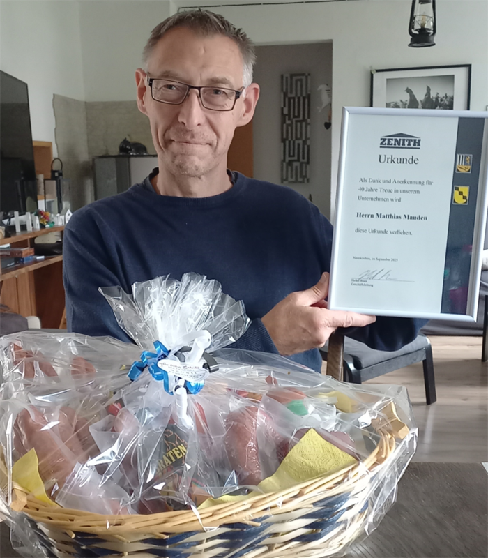 57 жастағы Маттиас Матхия мырза мырза Зенитте үш жылдық слесарьларды даярлау бағдарламасын аяқтады. Осы жылдар ішінде ол гидравликалық цилиндрлік цилиндрлер мен вибраторларда терең тәжірибесі бар гидротехника саласында жұмыс істейді. Сонымен бірге, ол сонымен бірге компаниядағы әріптестерінің қауіпсіздігін қамтамасыз ететін бірінші қайшы ретінде белсенді қызмет етті. Оның қырық жылдағы бағыты ZENITH-мен бірге оның өсуінің керемет сапарының куәсі болды.
